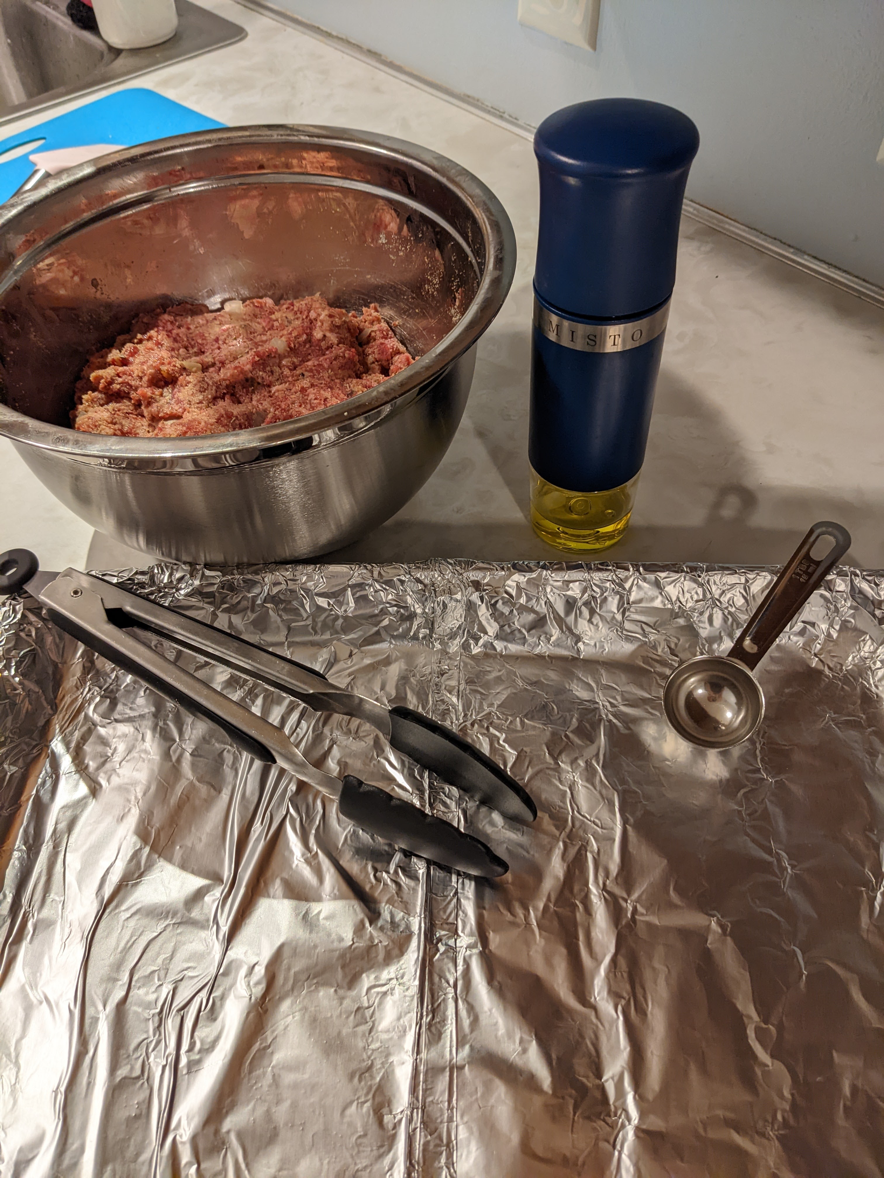 It’s important for the consistency of your balls, that you pre mix the dry goods well…just like fucking baking. Everything has to get folded in…just like fucking baking. It made me nervous in the beginning, so I overmixed my meat at first. I realized that premixing calmed my belligerent anxiety about making sure everything was evenly spread throughout. CHILL THE FUCK OUT. I only did that after I sloshed my egg mixture all over the counter trying to get it into my mixture. Epic shit show.